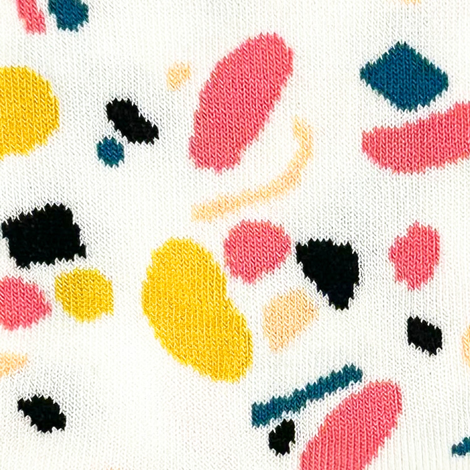 The patterns are created in Thomas Jakobson’s studio in Bern, inspired by the abstract shapes and colour worlds of artist Tania Bisaz. Each design is developed with care, tested through several prototype rounds, and then produced in a small sock factory in eastern Germany.
