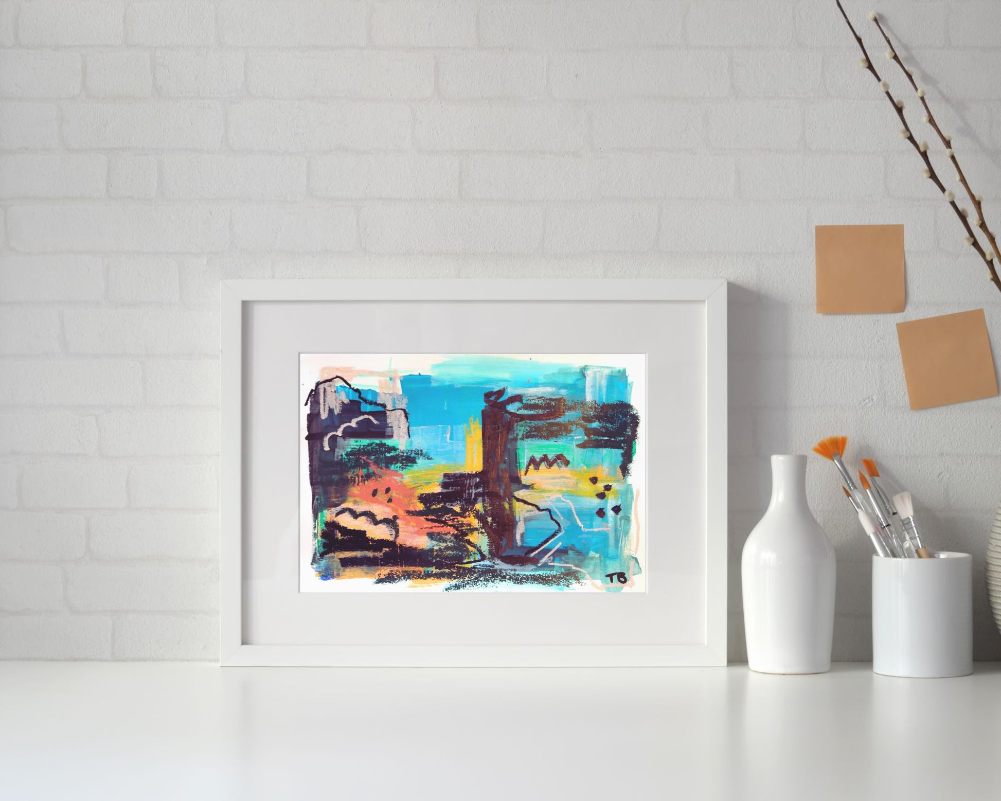 Created with acrylic, ink, pastel, and marker, this mixed-media piece balances intuitive mark-making with grounded structure, inviting the viewer to drift into an imagined horizon.
