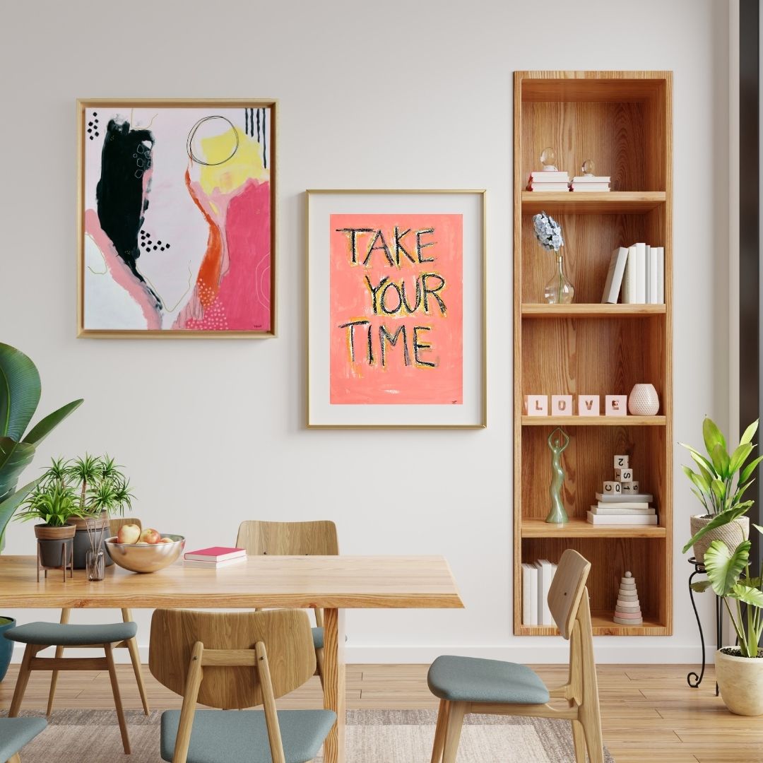 A bold and dynamic composition, Golden Horizon is an invitation to explore contrasts and movement through color and form. The deep black shape anchors the piece, while soft pinks, fiery reds, and a glowing yellow bring warmth and energy. Delicate golden lines and geometric details add texture and depth, making this artwork a captivating statement piece for any space.