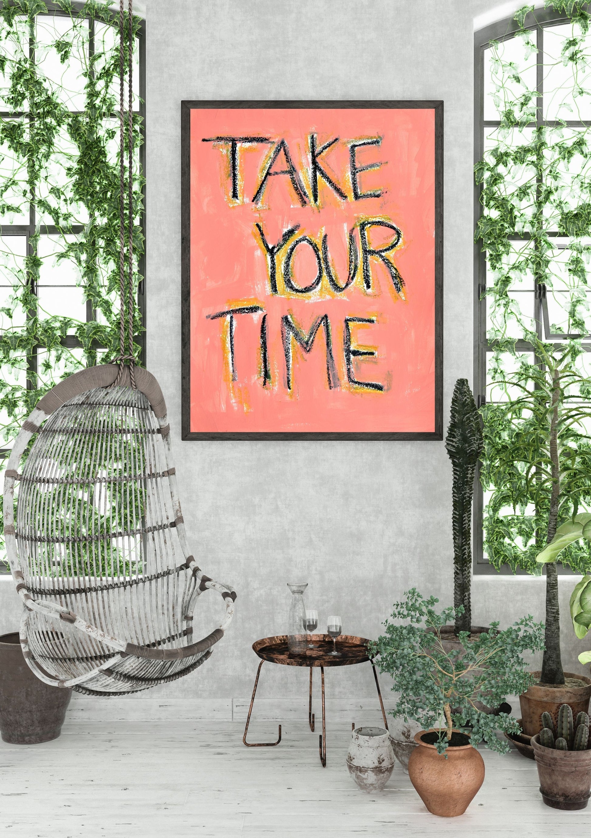 Take Your Time is a gentle reminder — painted boldly in coral pinks, layered yellows, and textured black strokes.